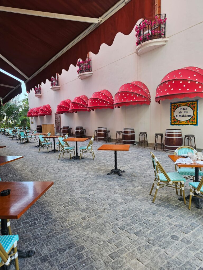 Lined with red and white polka-dot umbrellas, the street is designed to mimic the atmospheric charm of a rainy afternoon in southern Europe. Walking down the street as artificial rain falls around you is oddly refreshing and strangely calming. It adds a playful element to the stay while reinforcing the European inspiration that defines The Heart of Europe. I found myself returning to it more than once, just to experience it again at different times of day.
