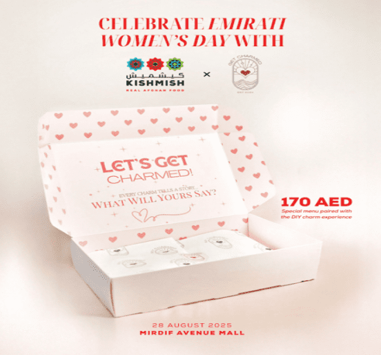 On August 28 at Mirdif Avenue, Kishmish, Dubai’s beloved Afghan restaurant, collaborates with Emirati brand Get Charmed for a jewellery-making workshop followed by an Afghan lunch menu for AED 170 per person. Dishes include chapli kebab, mantu dumplings, kabuli rice, aubergine, and Sheer Yakh ice cream.
