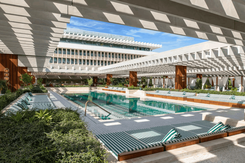 The building’s Brutalist architecture gave us a bold foundation, honest, expressive, and full of character. Rather than mask its original identity, we embraced it. We preserved the integrity of the structure while layering in The Ned’s signature aesthetic through rich textures, retro furnishings, and touches of Art Deco glamour. David Chipperfield Architects, in collaboration with Soho House Design, have reinterpreted the building’s legacy with remarkable sensitivity. The result is not nostalgic; it is evocative, celebrating an era defined by boldness and creativity, while paying homage to a significant piece of Qatar’s architectural heritage.