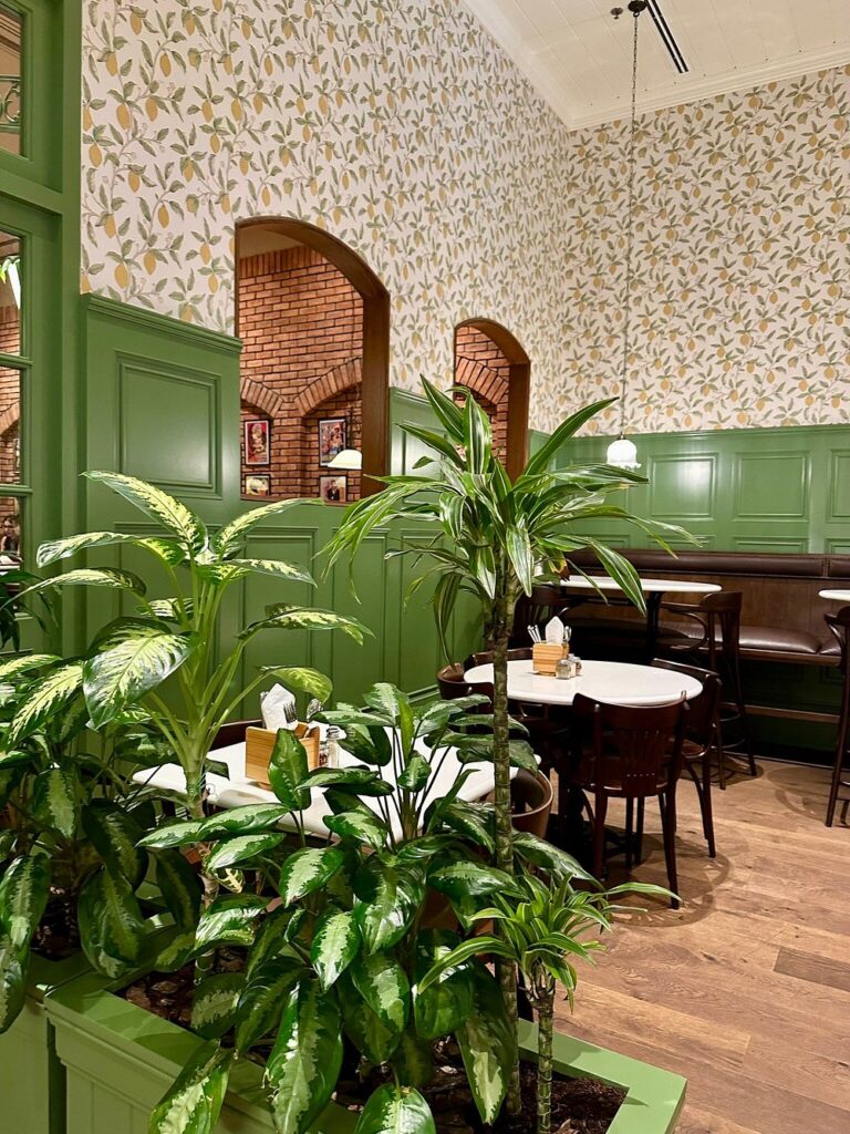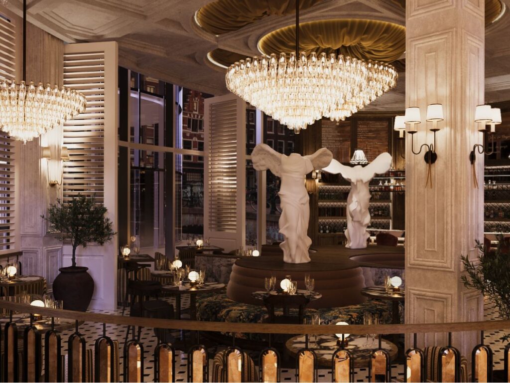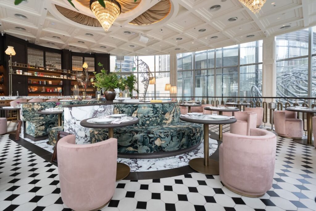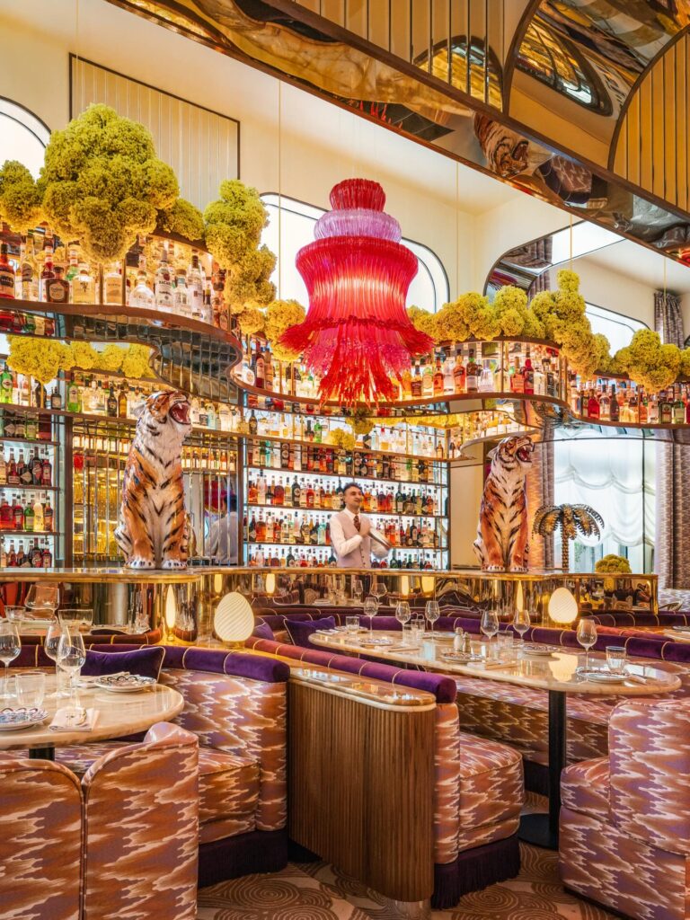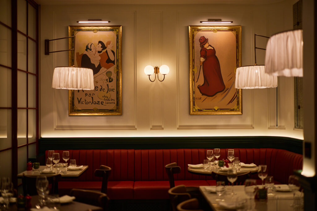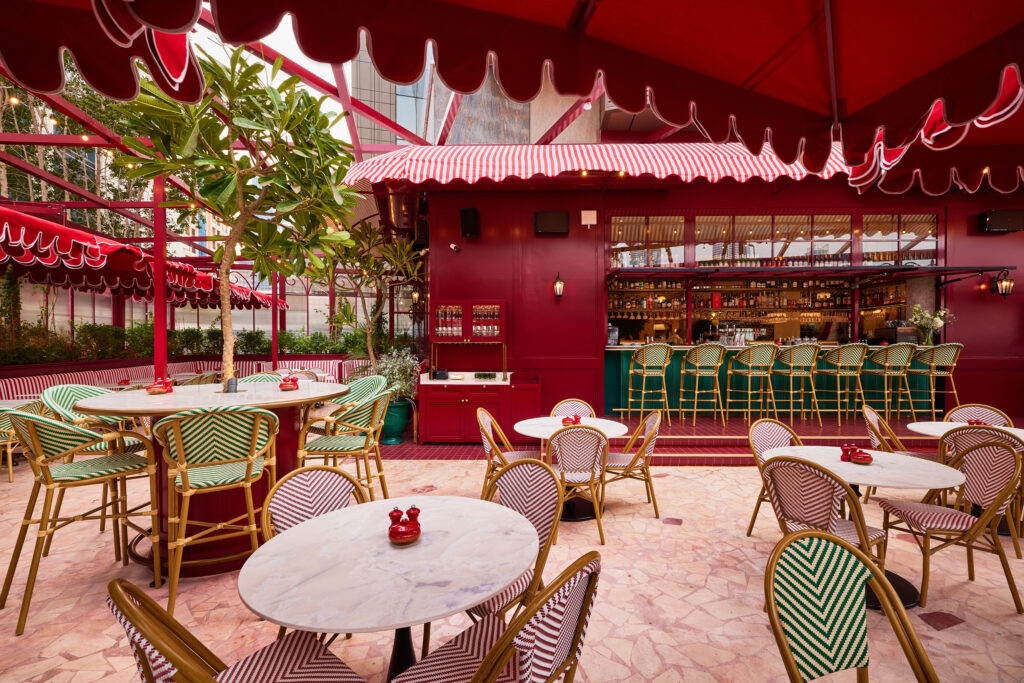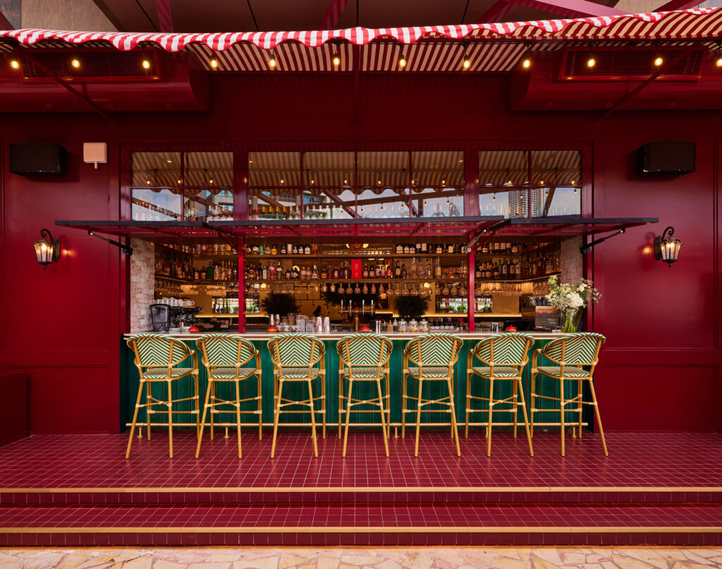Heritage elements like striped awnings, mosaic floors and brass accents are balanced by a deep palette of burgundy, deep greens, warm creams and muted reds. At the heart of the restaurant sits a Parisian-style island bar, crowned by the “Golden Rooster”, a symbol deeply rooted in French culture and central to the brand’s identity.