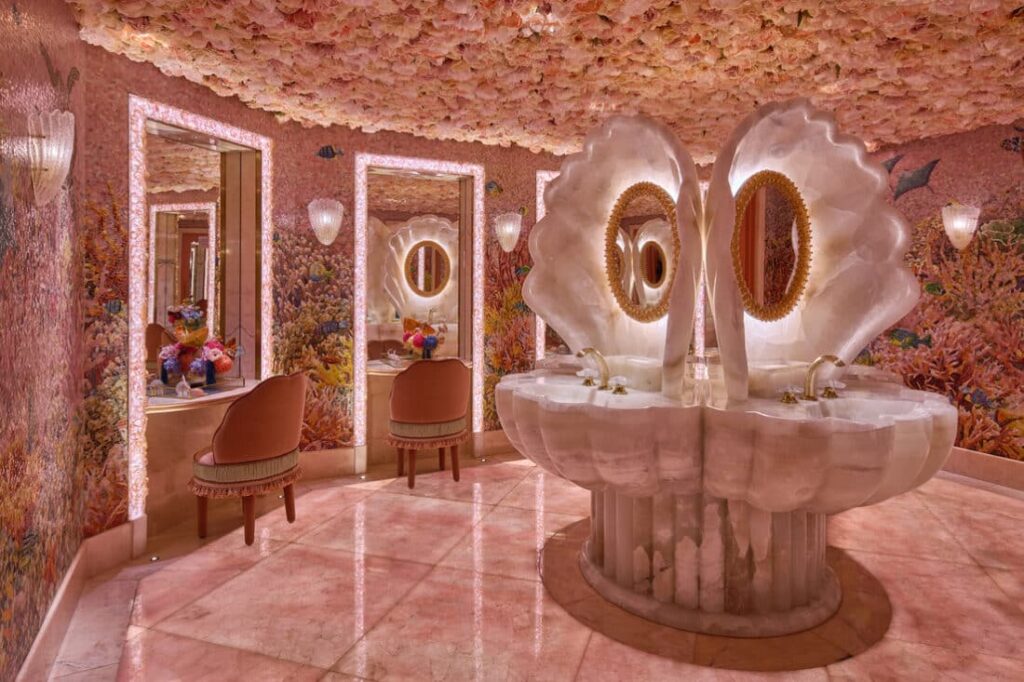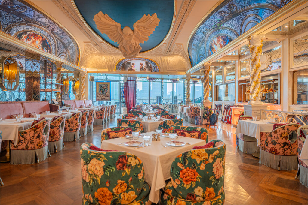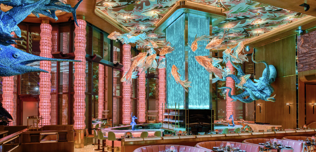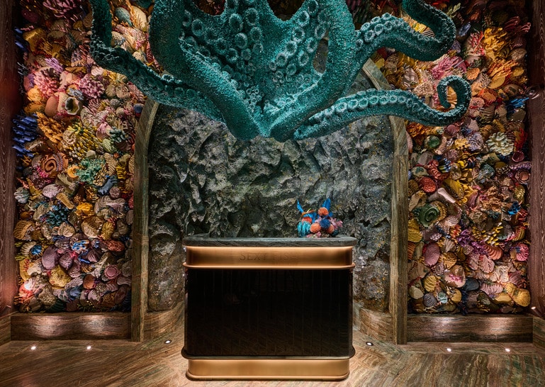 Located in DIFC, Sexy Fish is an unapologetic showcase of high-end contemporary art and mid-century glamour. The restaurant is adorned with works by world-renowned masters, featuring bronze mermaid sculptures by Damien Hirst and shimmering fish lamp installations by Frank Gehry. Every surface, from the intricately patterned floors to the coral-inspired accents, is a testament to a maximalist design philosophy that refuses to be ignored. Sexy Fish Dubai’s interiors have been designed by long-term collaborator Martin Brudnizki Design Studio with a mid-century glamour and opulence, underpinned by genuine hospitality.